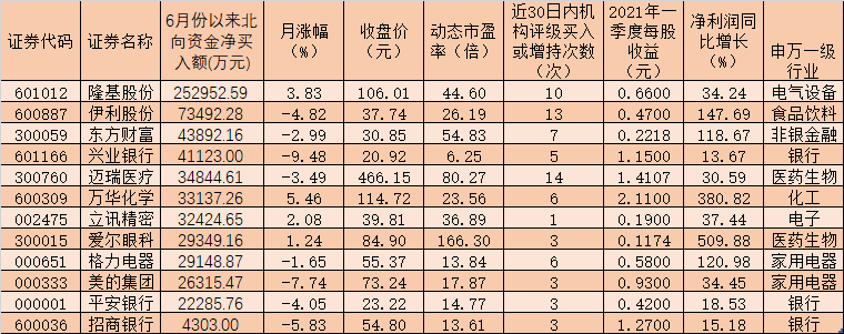 可以看到,近期外資持續(xù)流入A股,富時(shí)中國(guó)A50指數(shù)成份股成為外資搶籌的重點(diǎn)目標(biāo)。統(tǒng)計(jì)顯示,上述50只成份股中,6月份以來(lái)截至6月15日,有28只個(gè)股現(xiàn)身滬股通、深股通的前十大成交活躍股榜單,有12只成份股月內(nèi)處于北向資金凈買入狀態(tài),合計(jì)吸金62.33億元。其中,隆基股份期間累計(jì)北向資金凈買入額居首,達(dá)到25.30億元,伊利股份、東方財(cái)富、興業(yè)銀行、邁瑞醫(yī)療、萬(wàn)華化學(xué)、立訊精密等6只個(gè)股期間也均受到3億元以上北向資金青睞,后市表現(xiàn)值得關(guān)注。