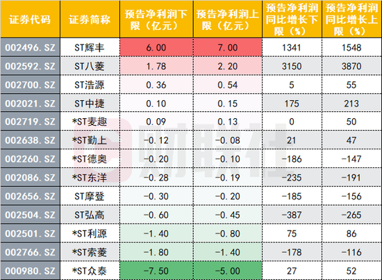 截至今日,ST股板塊已有33家企業(yè)發(fā)布中報預(yù)告,剔除其中僅作文字預(yù)告“預(yù)測不確定”、“凈利潤可能為虧損”的個股,已有5只獲風(fēng)險示警個股確定上半年業(yè)績?yōu)檎?,其中化工股ST輝豐(3.170,0.05,1.60%)(維權(quán))成績最為亮眼,預(yù)告凈利潤約6-7億,增長幅度高于1341%。此前屢遭炒作的*ST眾泰今年上半年則已確定虧損超5億元。