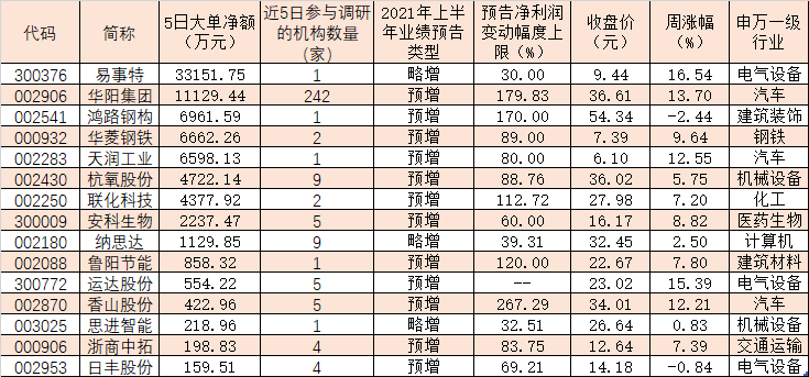 表:本周獲大單資金追捧且上半年業(yè)績(jī)預(yù)喜的機(jī)構(gòu)調(diào)研個(gè)股