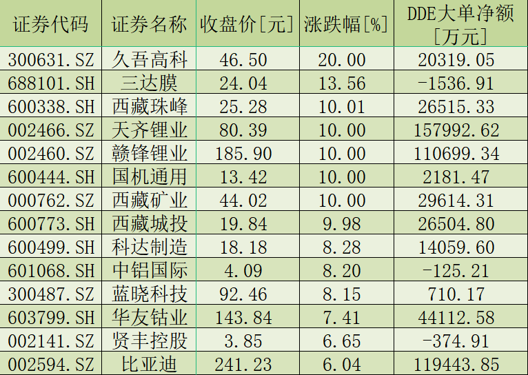當然,鹽湖提鋰板塊的行情也與資金面因素相關。今日,鹽湖提鋰板塊大單資金凈買入額為56.53億元,共有15只個股呈現大單資金凈買入狀態(tài),期間合計凈買入金額達到57.7億元。具體來看,天齊鋰業(yè)(157992.62萬元)、比亞迪(119443.85萬元)、贛鋒鋰業(yè)(110699.34萬元)3只個股獲大單資金凈買入額均超10億元;華友鈷業(yè)(44112.58萬元)、西藏礦業(yè)(29614.31萬元)、西藏珠峰(26515.33萬元)、西藏城投(26504.80萬元)、億緯鋰能(23569.89萬元)等個股獲大單資金凈買入額超2億元。