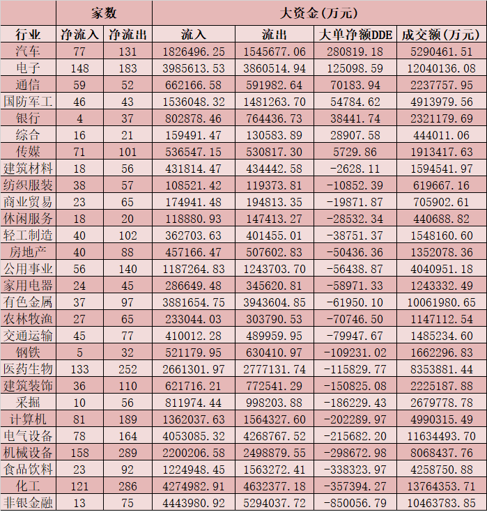 二、周四(8月19日)申萬一級行業(yè)大單資金流向