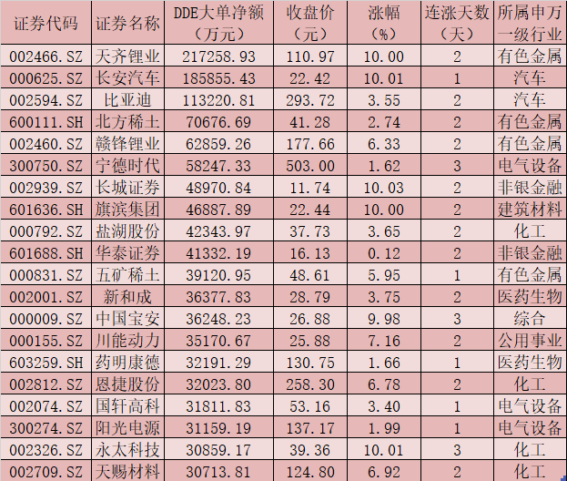 一、周四(8月19日)DDE大單資金凈買入TOP20