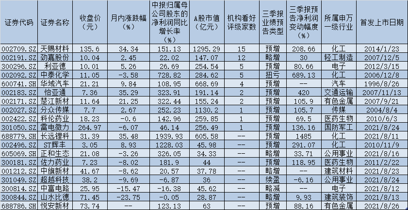 值得一提的是,上述業(yè)績(jī)預(yù)喜公司中,有10家公司最近1個(gè)月內(nèi)獲機(jī)構(gòu)給予“買入”或“增持”等看好評(píng)級(jí),其中,天賜材料、勁嘉股份等兩只個(gè)股機(jī)構(gòu)看好評(píng)級(jí)家數(shù)均在10家以上,分別為15家、12家,此外,利亞德、中泰化學(xué)、華域汽車、楚江新材、怡亞通等個(gè)股也均獲2家及以上機(jī)構(gòu)扎堆推薦。
