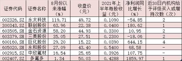 8月份以來,制冷劑板塊表現(xiàn)強勢,其整體上漲9.21%,跑贏上證指數(shù)(期間累計漲幅為6.61%),位居同花順板塊漲幅榜前列。具體到個股方面,永太科技期間股價實現(xiàn)翻番,達到119.71%,聯(lián)創(chuàng)股份、金石資源緊隨其后,期間累計漲幅分別為63.96%、58.20%,三美股份、巨化股份、永和股份、中欣氟材等4只概念股期間累計漲幅也均逾10%。