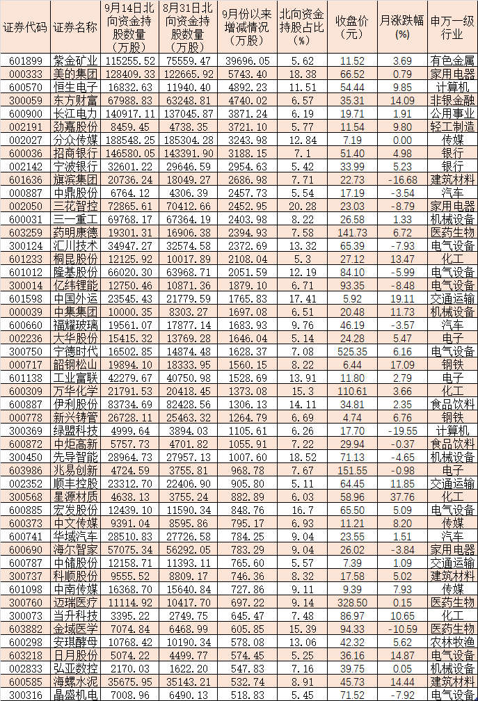 表:9月份以來北向資金增持?jǐn)?shù)量超1000萬股且持股比例在5%以上的個(gè)股