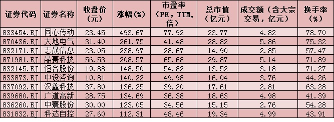 其六,同心傳動漲幅最大,截至收盤漲幅達(dá)493.67%,盤中一度漲超500%,牢牢占據(jù)新股漲幅榜首位。周一,10只北交所的新股開盤全線大漲,截至收盤,10只新股漲幅均超100%,平均漲幅達(dá)199.8%。