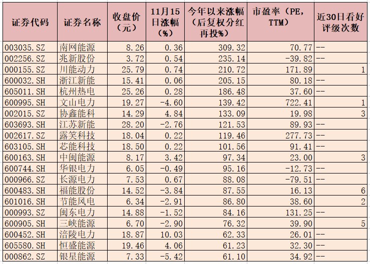 隨著電力行業(yè)的發(fā)展以及電價的改革,電力股也受到投資者的重點關(guān)注。今年電力板塊曾迎來一波上漲,申萬二級電力指數(shù)從年初的2503.40點逐漸漲到9月23日的3639.29高點,在經(jīng)過一段時間的高漲之后,近期電力指數(shù)出現(xiàn)震蕩回調(diào),截至11月15日收盤,電力指數(shù)最新報3072.51點,整體來看,今年以來,電力板塊表現(xiàn)仍顯強勢,電力指數(shù)期間累計漲20.66%,大幅跑贏同期上證指數(shù)(漲1.73%),其中,南網(wǎng)能源、兆新股份、川能動力、浙江新能等4只個股期間累計漲幅均超2倍。