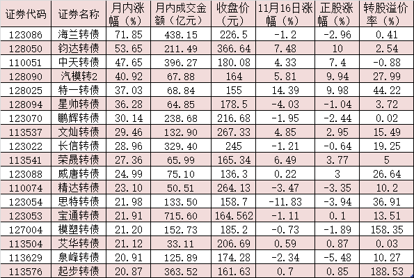 同花順數(shù)據(jù)統(tǒng)計發(fā)現(xiàn),在當前可交易的370只可轉債中,328只可轉債11月份以來實現(xiàn)上漲,占比近九成。其中,59只可轉債月內(nèi)累計漲幅超10%,海蘭轉債、鈞達轉債月內(nèi)大漲均在50%以上,分別為71.85%、53.65%,中天轉債、汽模轉2、特一轉債、星帥轉債、鵬輝轉債等5只可轉債月內(nèi)累計漲幅也均逾30%,表現(xiàn)搶眼。