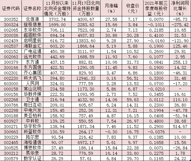 表:11月份以來獲北向資金增持的智慧政務(wù)概念股