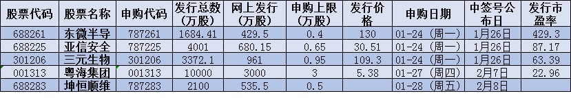 表:下周(1月24日-1月28日)5只新股申購情況: