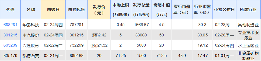 表:下周(2月21日-2月25日)4只新股申購(gòu)情況: