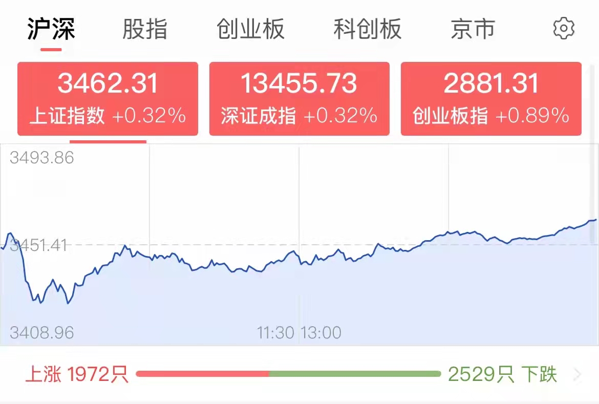 周一,A股三大指數(shù)探底回升,集體收漲,截至收盤,上證指數(shù)漲0.32%,報3462.31點;深證成指漲0.32%,報13455.73點;創(chuàng)業(yè)板指漲0.89%,報2881.31點;滬深兩市合計成交額9491億元;北向資金凈買入20.47億元;總體來看,兩市個股跌多漲少。
