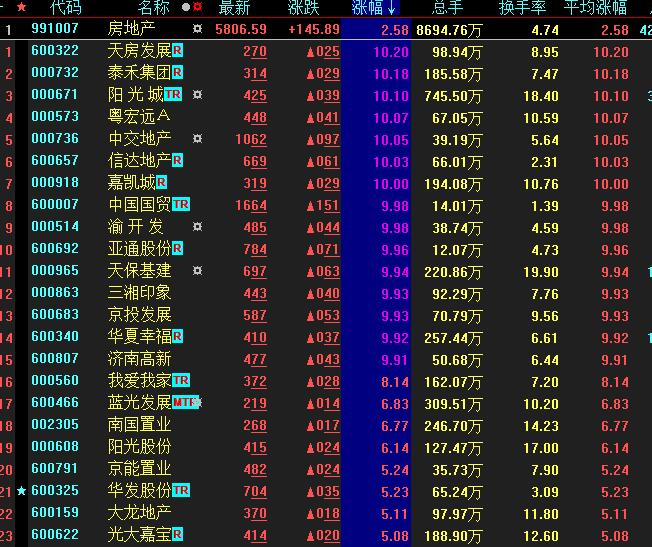 周一,地產(chǎn)股表現(xiàn)強勁,截至收盤,板塊漲幅達2.58%。粵宏遠、天房發(fā)展、陽光城、中交地產(chǎn)等15只地產(chǎn)股集體漲停。其中,天?;ㄗ邉輷屟?,連續(xù)9個交易日漲停。