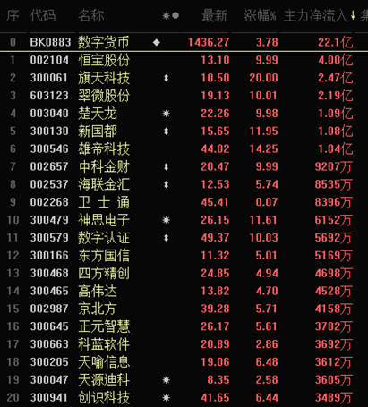 周四,數(shù)字貨幣概念走強(qiáng),截至收盤,大漲3.79%,居?xùn)|方財富概念板塊漲幅榜首位。其中,5只個股收于漲停。