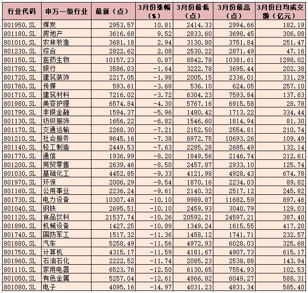 表:3月份申萬一級行業(yè)指數(shù)表現(xiàn)一覽