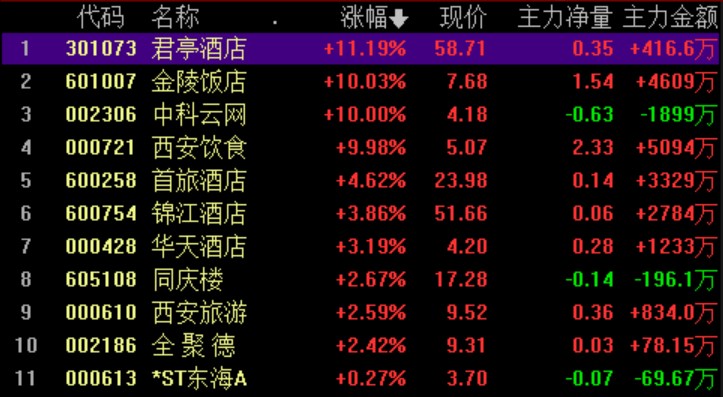 酒店及餐飲板塊開(kāi)盤(pán)后持續(xù)拉升,板塊內(nèi)個(gè)股全部實(shí)現(xiàn)上漲,其中,金陵飯店、中科云網(wǎng)、西安飲食集體漲停。