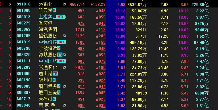 周五,運輸業(yè)板塊異軍突起,漲幅達(dá)2.98%。其中,8只概念股集體漲停。盛航股份兩連板。