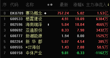 概念板塊方面,早盤賽馬板塊表現(xiàn)強勁,跳空高開并創(chuàng)出近期高點,截至午間收盤,早盤上漲5.02%。
