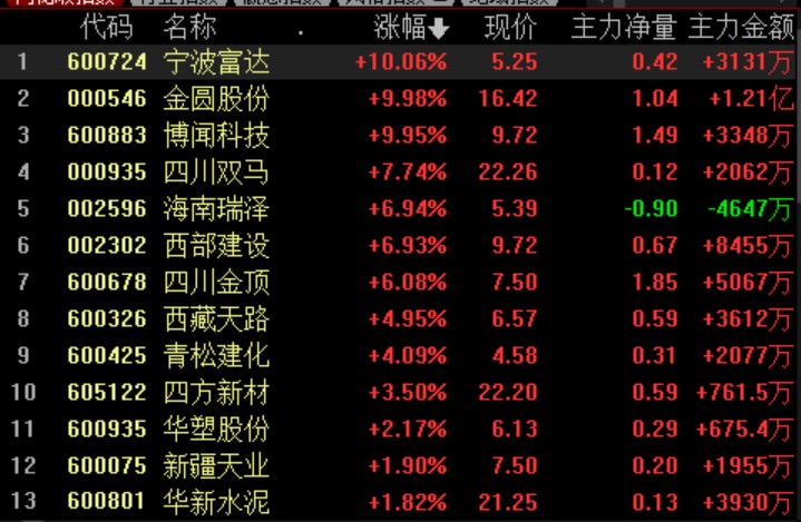 水泥概念板塊盤中拉升領(lǐng)漲,其中,寧波富達(dá)、金圓股份、博聞科技集體漲停。
