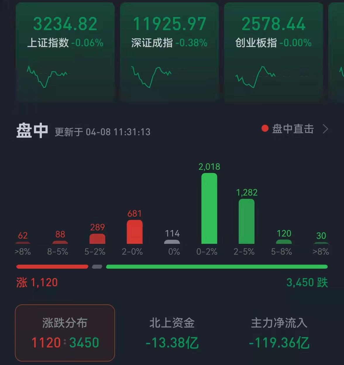 4月8日,A股三大指數(shù)呈震蕩整理態(tài)勢。截至上午收盤,上證指數(shù)微跌0.06%,報3234.82點;深證成指和創(chuàng)業(yè)板指跌幅分別為0.38%和0.09%;滬深兩市合計成交額5855.1億元;總體來看,兩市個股跌多漲少,上漲家數(shù)達(dá)1120家。