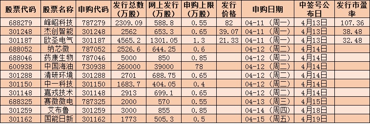 4月11日,冠龍節(jié)能將在創(chuàng)業(yè)板登陸。下周(4月11日-15日)將有12只新股發(fā)行,累計(jì)發(fā)行數(shù)量約33億股,預(yù)計(jì)募集資金75.92億元。其中,4月11日發(fā)行的是峰岹科技、杰創(chuàng)智能、歐圣電氣,4月12日發(fā)行的是納芯微、藥康生物、中國(guó)海油、清研環(huán)境、中一科技、嘉戎技術(shù),4月13日發(fā)行的是賽微微電,4月14日發(fā)行的是艾布魯,4月15日發(fā)行的是國(guó)能日新。