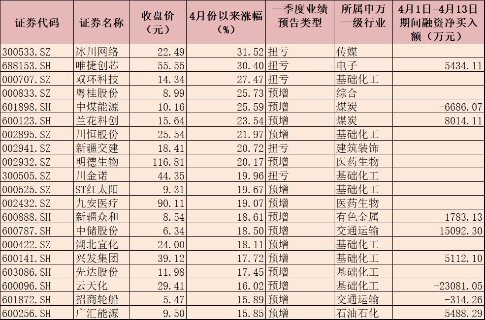 表:4月份以來漲幅超15%的業(yè)績預(yù)喜股一覽