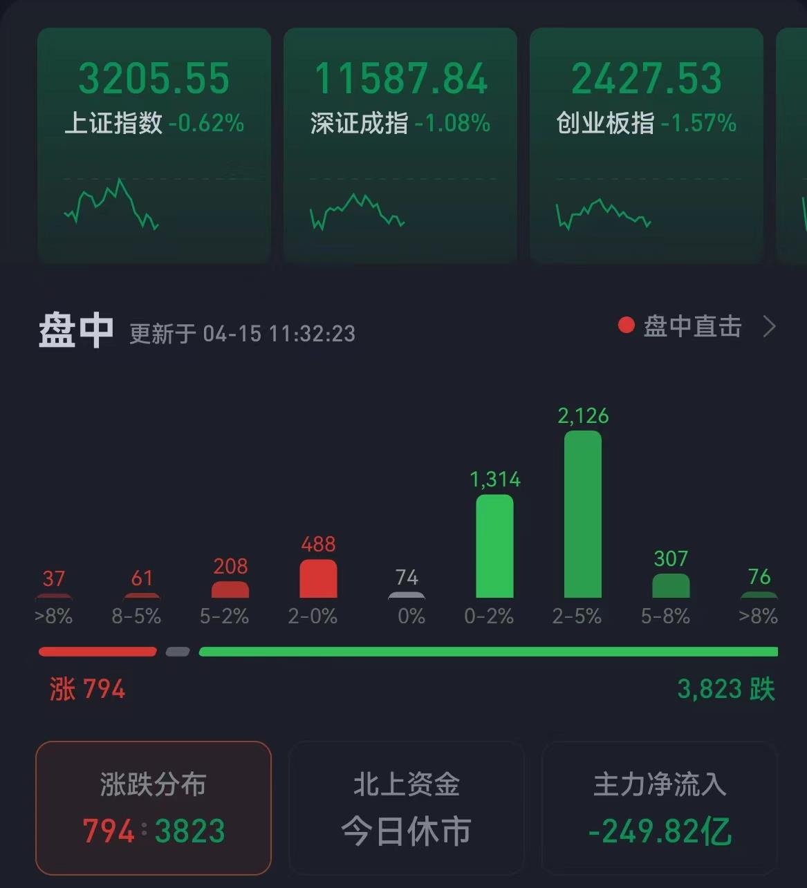4月15日,A股三大指數(shù)震蕩回落。截至上午收盤,上證指數(shù)跌幅達(dá)0.62%,報(bào)3205.55點(diǎn);深證成指和創(chuàng)業(yè)板指跌幅分別為1.08%和1.57%;滬深兩市合計(jì)成交額5760.6億元;總體來(lái)看,兩市個(gè)股跌多漲少,下跌個(gè)股達(dá)3823只。