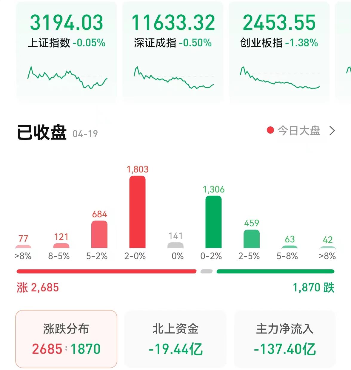 截至收盤(pán),上證指數(shù)跌0.05%報(bào)3194.03點(diǎn),深證成指跌0.5%報(bào)11633.32點(diǎn),創(chuàng)業(yè)板指跌1.38%報(bào)2453.55點(diǎn);兩市合計(jì)成交7793.9億元,北向資金凈賣(mài)出19.44億元。