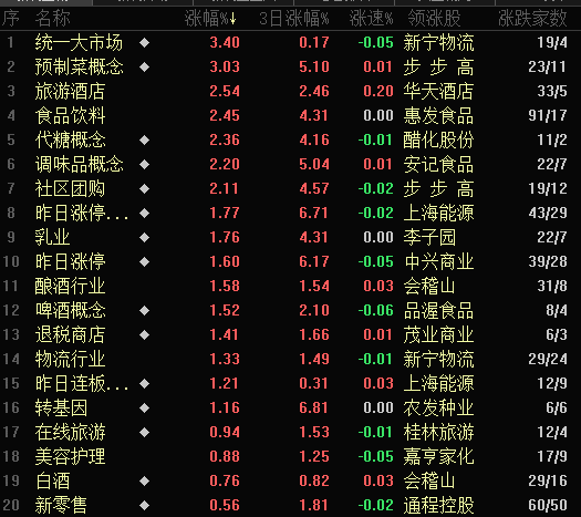 熱點(diǎn)方面,周三,統(tǒng)一大市場(chǎng)、預(yù)制菜概念、代糖概念、調(diào)味品概念、社區(qū)團(tuán)購(gòu)等概念板塊強(qiáng)勢(shì)上漲,漲幅均超2%;行業(yè)則以旅游酒店和食品飲料領(lǐng)漲。煤炭、貴金屬和鋼鐵行業(yè)居前,跌幅均在4%以上。