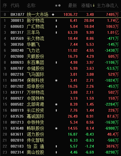 4月20日,統(tǒng)一大市場(chǎng)概念表現(xiàn)出色,截至收盤(pán),板塊漲幅達(dá)3.40%。個(gè)股中,新寧物流、廣匯物流、三羊馬等3只概念股集體漲停。