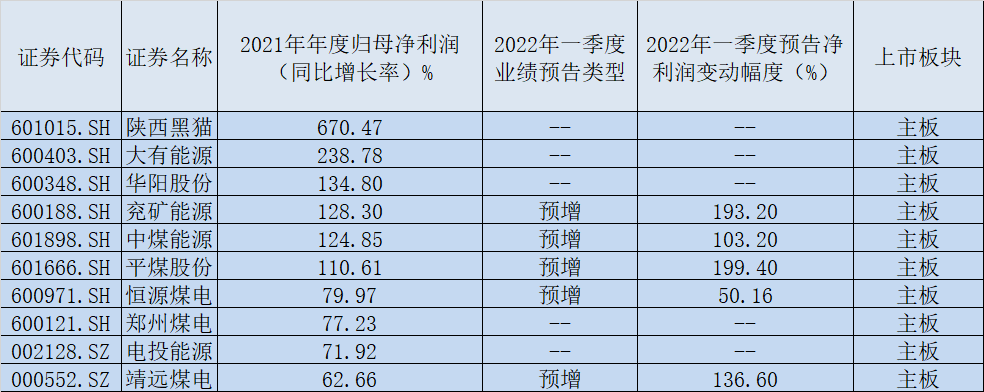 此外,已有14家公司披露了2022年一季度業(yè)績預告且全部預喜。其中,冀中能源、蘭花科創(chuàng)、上海能源、ST大洲、平煤股份、兗礦能源、山西焦煤、靖遠煤電、中煤能源等9家公司歸母凈利潤有望實現(xiàn)同比翻番。