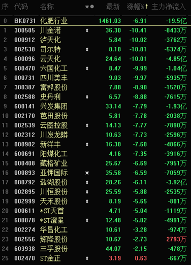 周四,化肥行業(yè)跌幅居前。化肥行業(yè)指數(shù)報(bào)1461.03點(diǎn),跌幅達(dá)6.91%,成交168.62億元,換手率4.11%。板塊個(gè)股中有4只個(gè)股跌停。