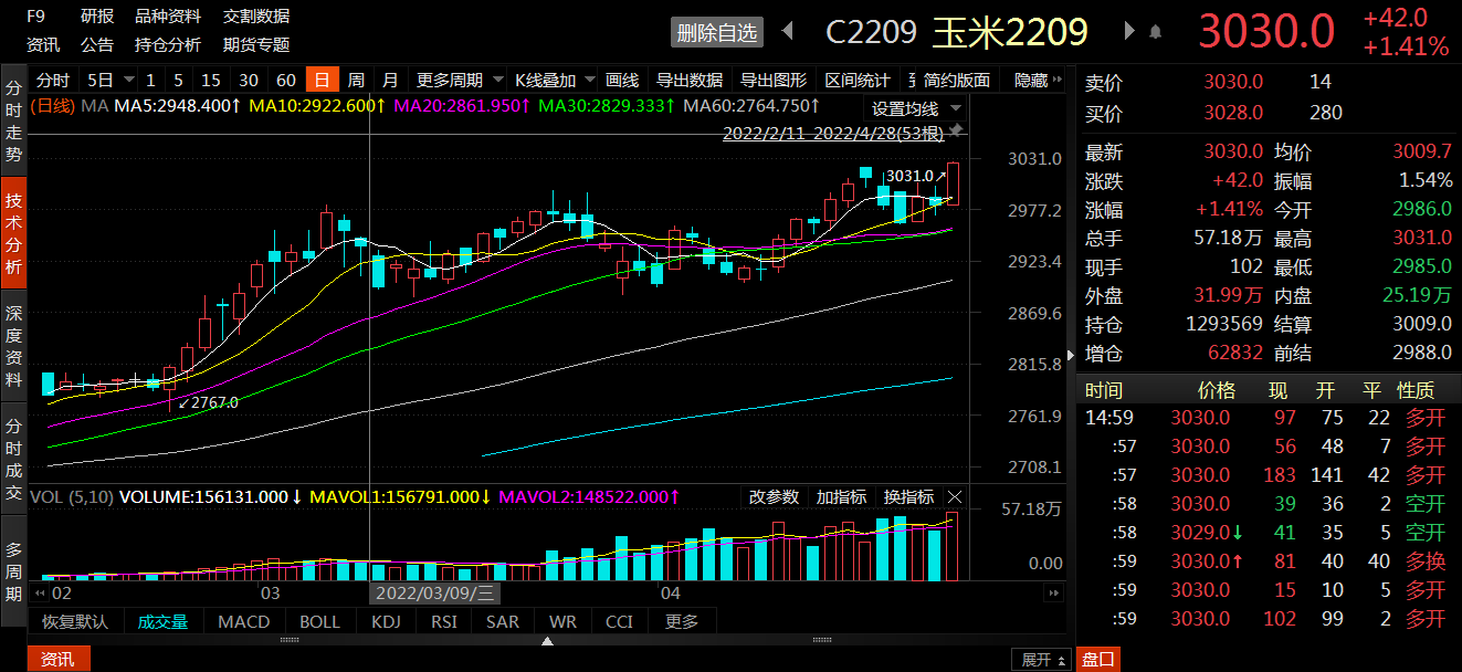 在談及國內(nèi)玉米期貨價格上漲時,王俊棠表示,“首先,由于國內(nèi)小麥價格高企,支撐玉米價格。近期小麥價格波動幅度較大,相關(guān)企業(yè)已采取措施穩(wěn)定小麥價格;其次,東北疫情或影響新季玉米播種進(jìn)度;最后,3月份需求端飼料企業(yè)生產(chǎn)的配合飼料中玉米用量占比為36.1%,同比增長5%。種種因素都對玉米價格產(chǎn)生了影響。”