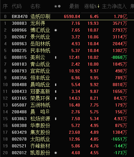 造紙印刷板行業(yè)早盤拉升,強(qiáng)勢(shì)一直保持到收盤,收?qǐng)?bào)6590.84點(diǎn),漲幅6.45%,有包括龍利得、博匯紙業(yè)、景興紙業(yè)在內(nèi)的11只個(gè)股漲停。
