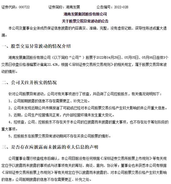湖南發(fā)展今天發(fā)布的股票交易異常波動(dòng)公告,對(duì)異動(dòng)情況進(jìn)行5點(diǎn)說明,并進(jìn)一步表示,沒有應(yīng)披露而未披露的事項(xiàng),公司前期披露的信息不存在需要更正、補(bǔ)充之處。