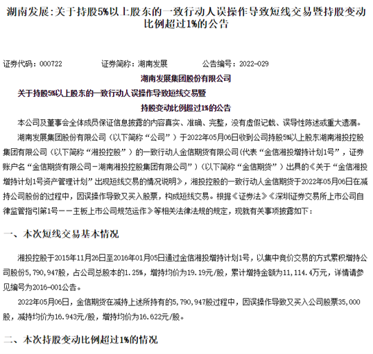 不過,5月6日有一則公告,涉及5%以上股東一致行動(dòng)人誤操作。公司公告顯示,2022年05月06日,金信期貨在減持上述所持有的5,790,947股過程中,因誤操作導(dǎo)致又買入公司股票35,000股,減持均價(jià)為16.943元/股,增持均價(jià)為16.622元/股。