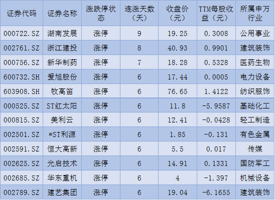表:連漲超6日且今日收盤漲停股一覽