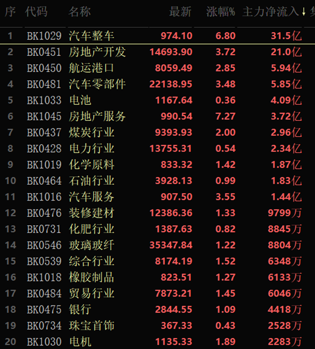 從資金流向看,汽車整車排名居首,大單資金凈流入達(dá)31.5億元,房地產(chǎn)開發(fā)以21億元居第二位。