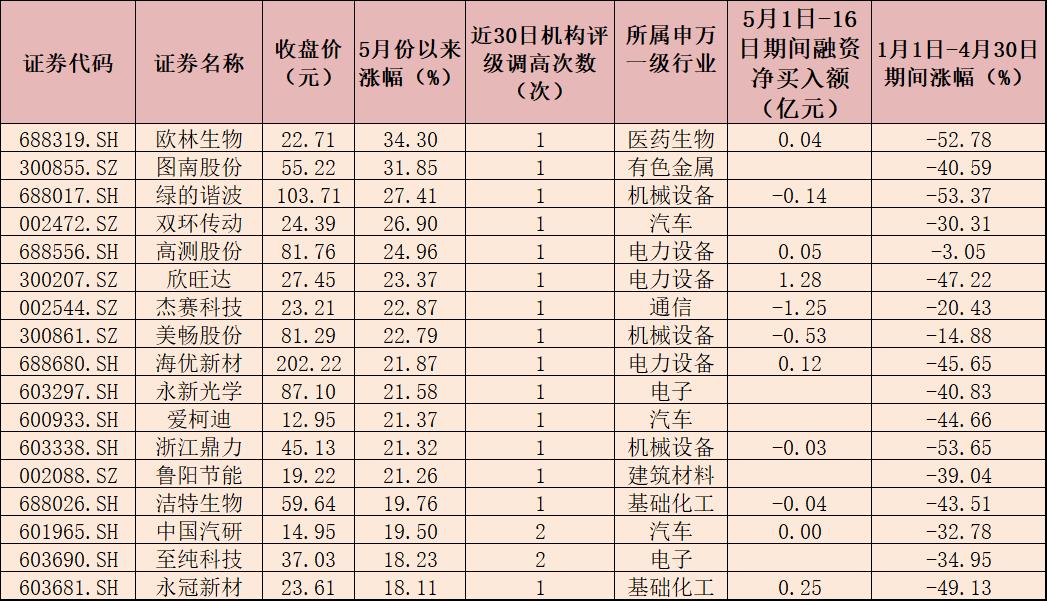 表:5月份以來漲幅超18%的機(jī)構(gòu)調(diào)高評級股一覽