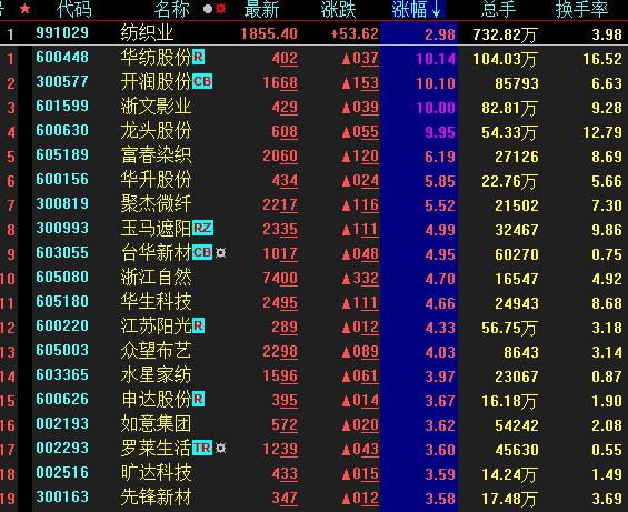 5月18日,大智慧紡織業(yè)板塊漲幅居首,達2.98%。其中,華紡股份、浙文影業(yè)、龍頭股份等3只概念股集體漲停。