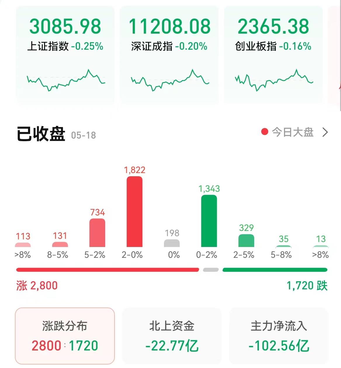 5月18日,三大股指震蕩走低,集體收跌,截至收盤,上證指數(shù)跌0.25%報3085.98點;深證成指跌0.2%報11208.08點;創(chuàng)業(yè)板指跌0.16%報2365.38點;兩市合計成交7703億元,北向資金凈賣出22.77億元??傮w來看,兩市個股漲多跌少。