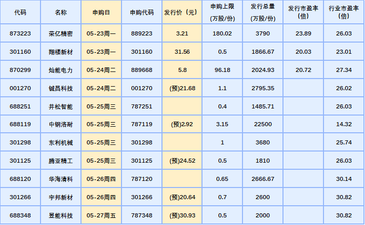 IPO方面,根據(jù)發(fā)行安排,A股市場(chǎng)下周(5月23日-27日)將有11只新股申購(gòu),按所屬板塊,滬市科創(chuàng)板4只,深市主板1只,創(chuàng)業(yè)板4只,北交所2只。