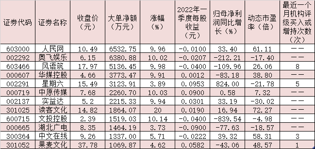 表:5月23日受到千萬元以上大單資金追捧的文化傳媒股