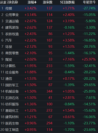 從申萬一級行業(yè)看,傳媒行業(yè)指數(shù)收報527.58點,漲幅達3.42%,居申萬行業(yè)首位。