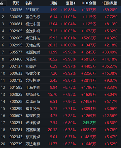 從個股來看,傳媒行業(yè)143只交易的個股中,有137只上漲,其中,有9只漲停報收。