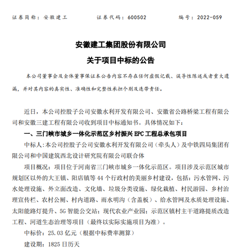 安徽建工公告,公司控股子公司安徽水利開發(fā)有限公司(牽頭人)及中鐵四局集團有限公司和中國建筑西北設(shè)計研究院有限公司聯(lián)合體中標三門峽市城鄉(xiāng)一體化示范區(qū)鄉(xiāng)村振興EPC工程總承包項目,中標價25.03億元;公司控股子公司安徽省公路橋梁工程有限公司中標G36寧洛高速公路明光至蚌埠段改擴建工程施工TJ-01標段項目,中標價6.69億元;公司控股子公司安徽三建工程有限公司中標引江濟淮工程同大鎮(zhèn)二龍安置點(二期)及同大鎮(zhèn)集鎮(zhèn)安置點項目,中標價10.90億元。合計中標金額42.62億元。