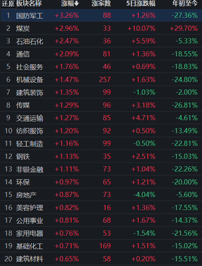 從申萬一級(jí)行業(yè)看,有23類行業(yè)上漲,國防軍工行業(yè)領(lǐng)漲,漲幅達(dá)3.26%,煤炭、石油石化和通信等3行業(yè)漲幅均在2%以上。此外,綜合行業(yè)跌幅居首,達(dá)0.80%。