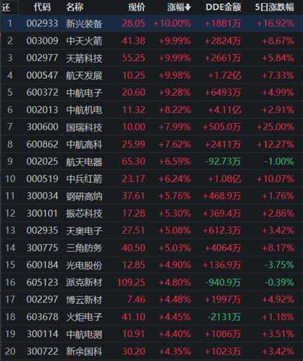 從個(gè)股來看,國防軍工行業(yè)98只交易的個(gè)股中,有90只上漲,其中,有4只個(gè)股漲停報(bào)收。