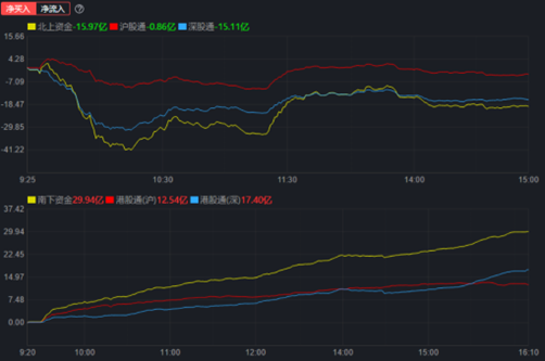 北向資金今日呈凈流出態(tài)勢,全天凈買入-15.97億元,其中,滬股通凈買入-0.86億元,深股通凈買入-15.11億元。