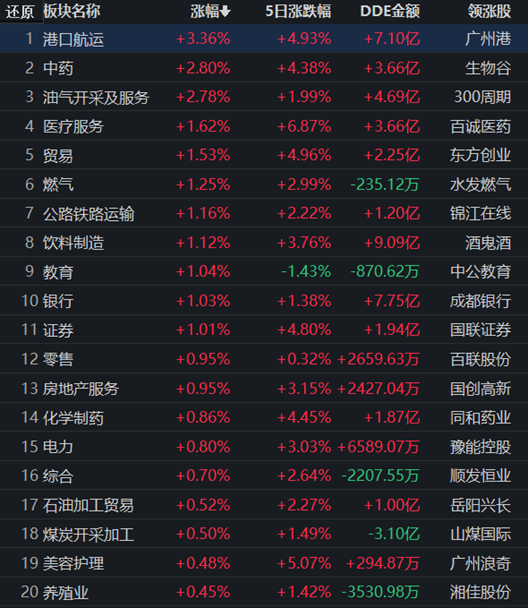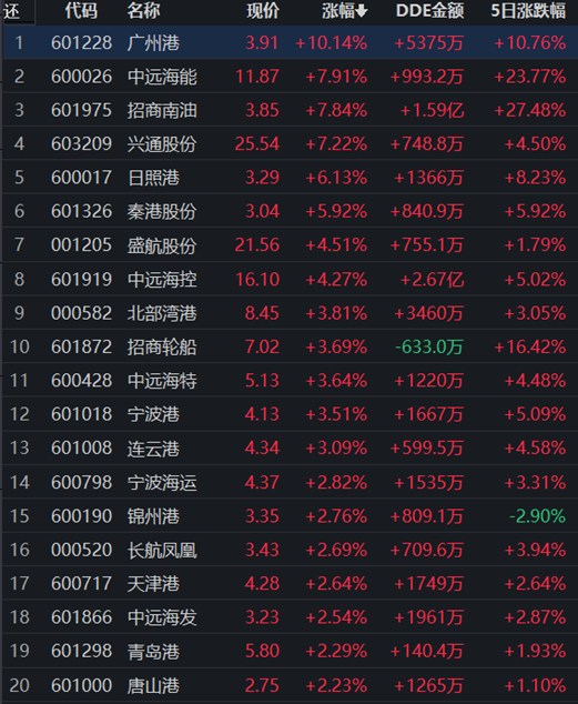 從領(lǐng)漲的港口航運(yùn)行業(yè)看,截至6月7日11:30,行業(yè)的32只個(gè)股中,有5只漲幅超5%,其中,廣州港封漲停板。